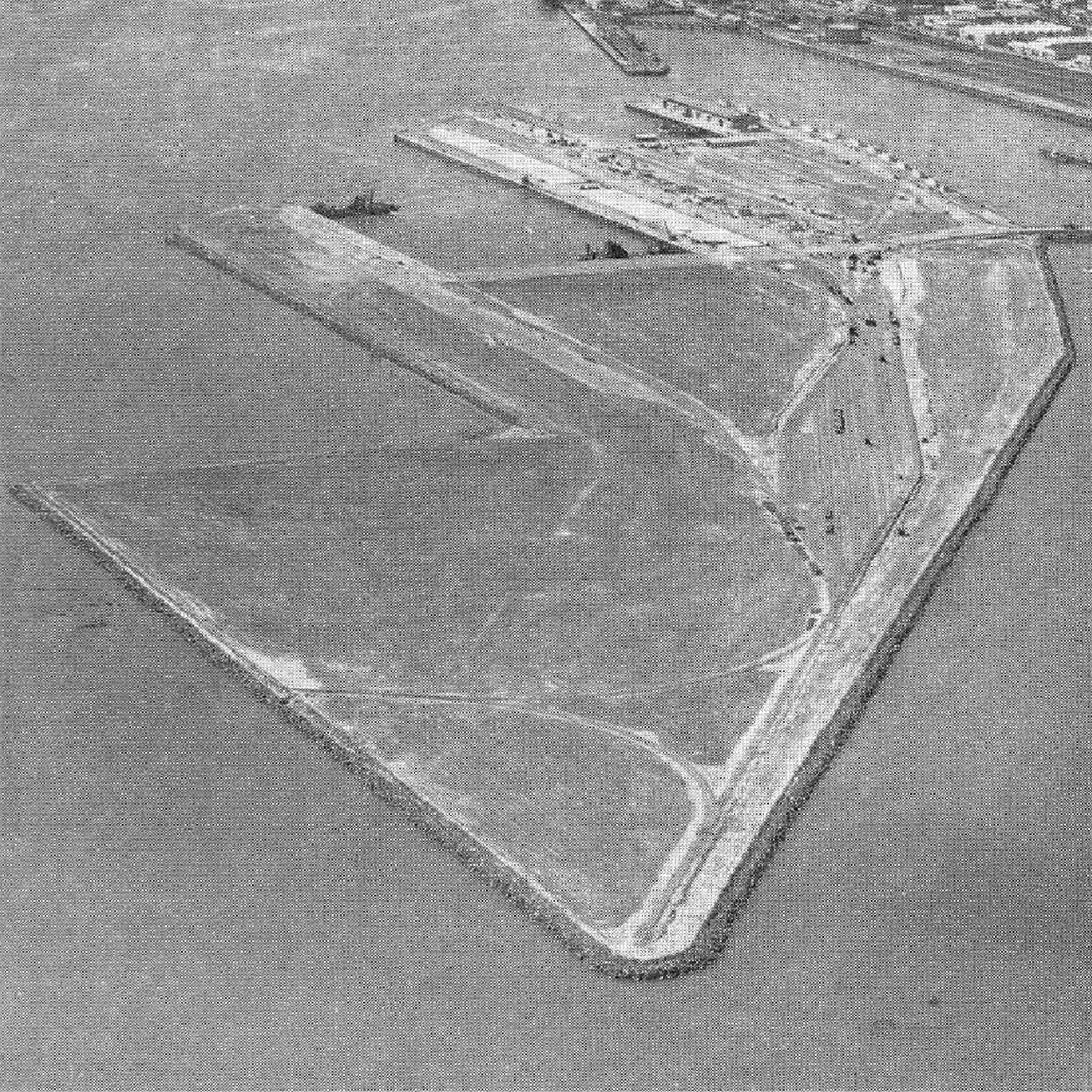 Tenders were called for Stage 1 on 4 August 1955 and on 1 May 1956, a tender of £3,221,438 ($6,442,876) was accepted from the French firm Societe Nationale de Travaux Publics (S.N.T.P.). Work began in September 1956 with the construction of a temporary bridge to the future island. Rock was dumped off the sea end of the bridge and so the start of the rubble retaining walls commenced which would spread out laterally to outline the perimeter of the island. At the same time, protective steel pilings were driven in around the berths and sand was then pumped by a cutter suction dredge into the area enclosed by the retaining wall and pilings. As work progressed coffer dams held back the sea while the quay walls were concreted. These were later removed and the berths flooded.