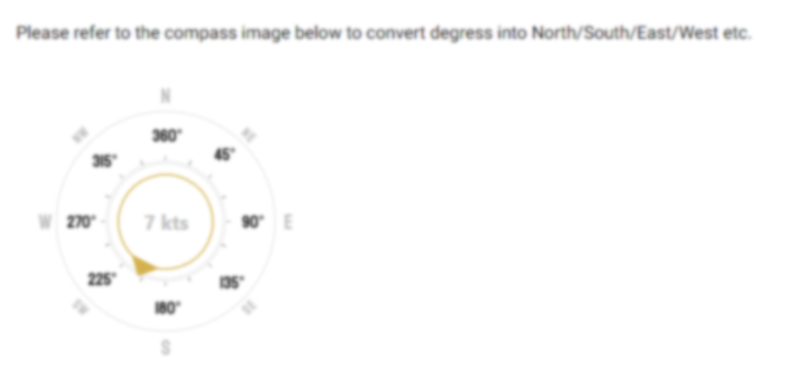 Please refer to the compass image below to convert degress into North/South/East/West etc.