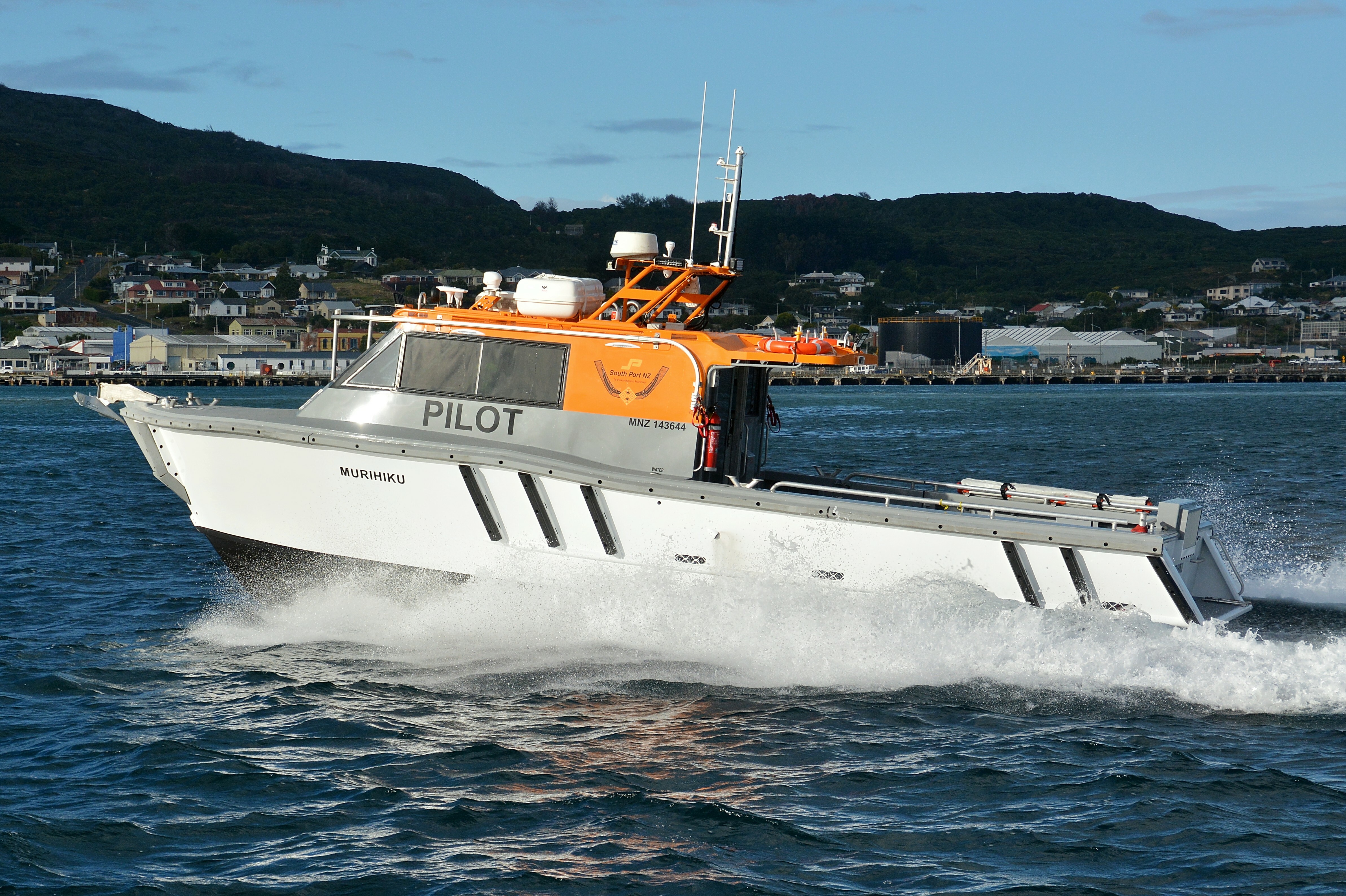 Aluminium vessel with orange wheelhouse. “Pilot” on side of wheelhouse
