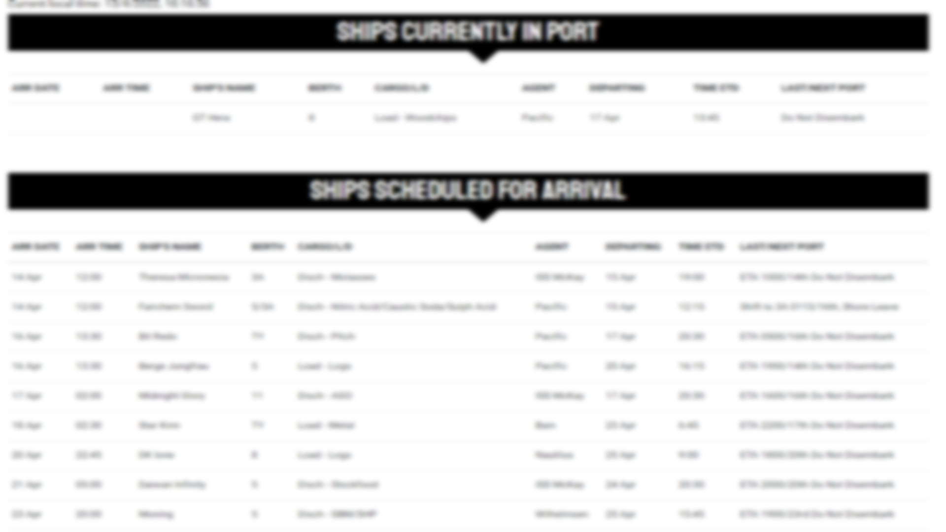 Check the following tables to find out what ships are currently in port and due to arrive in the coming days.