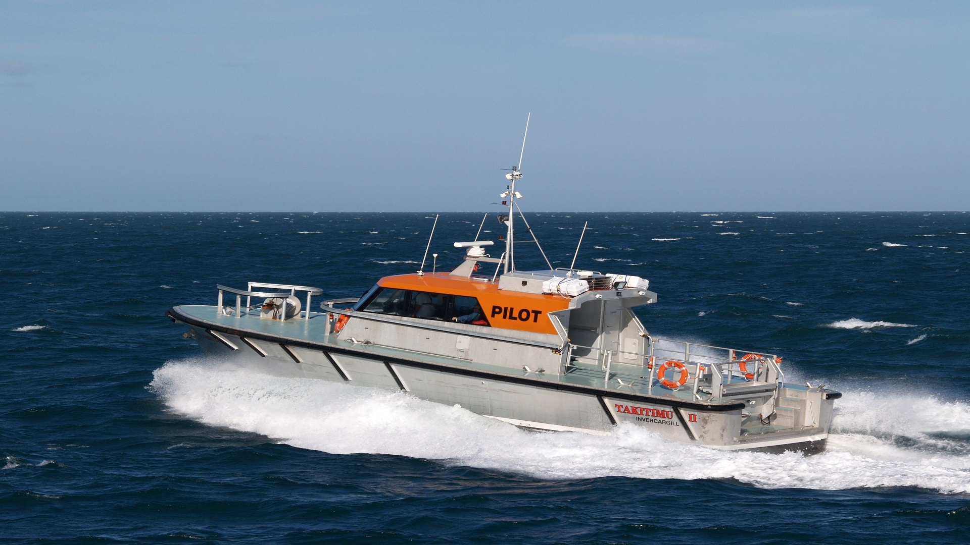 Aluminium vessel with orange wheelhouse. “Pilot” on side of wheelhouse